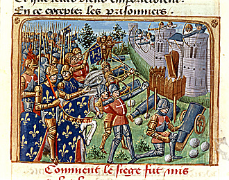 Surrender of Cherbourg to the French under the command of King Charles VII in 1450. From “Vigiles du feu roi Charles septième”. Illuminated manuscript; France; 15th century.