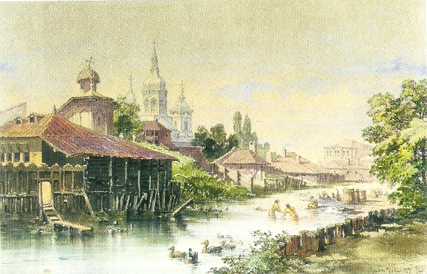 Manastirea Radu Voda 1869 - acuarela de Preziosi. Oamenii obisnuiau sa bea apa, acolo unde se si scaldau. (vezi butoaiele)